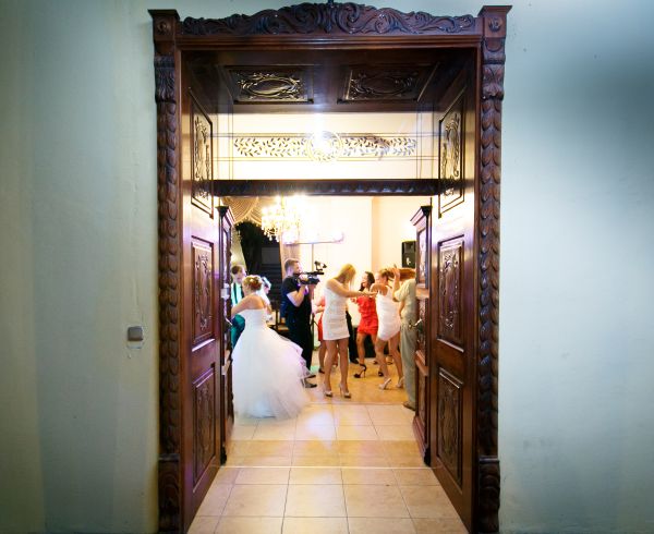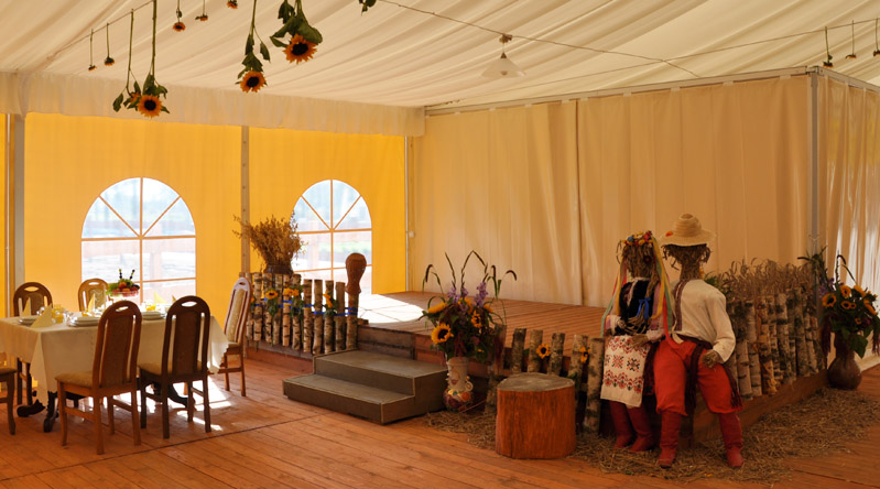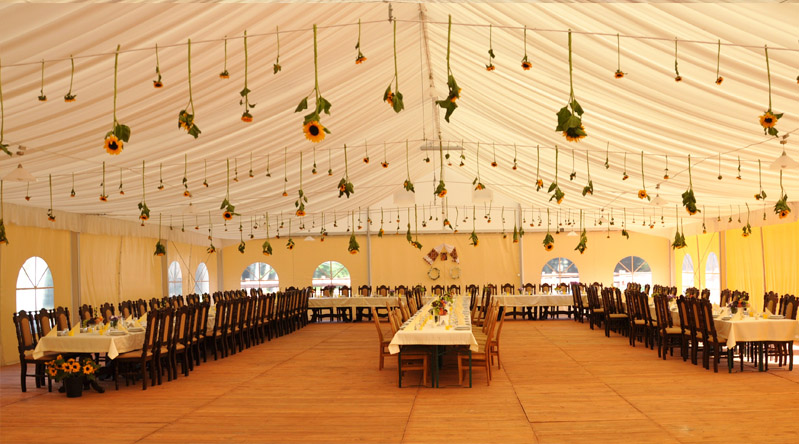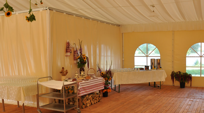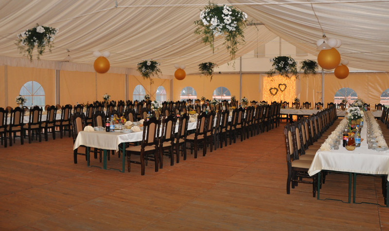 Istnieje możliwość zorganizowania przyjęcia w środku budynku, we wcześniej wspomnianej już Sali Balowej lub w profesjonalnym namiocie, mieszczącym nawet do 300 osób.
